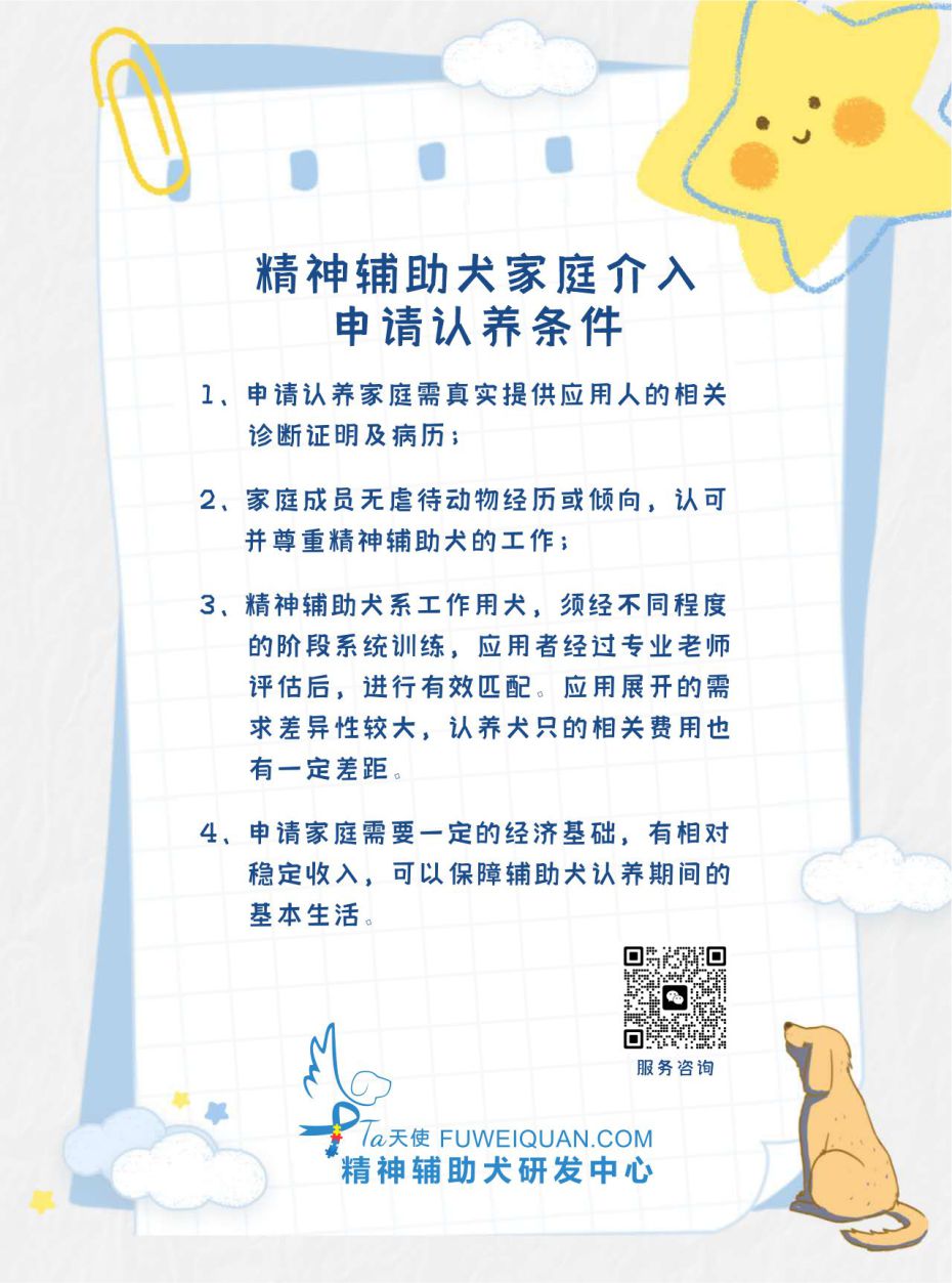 2、家庭成员无虐待动物经历或倾向,认可并尊重精神抚慰犬工作;